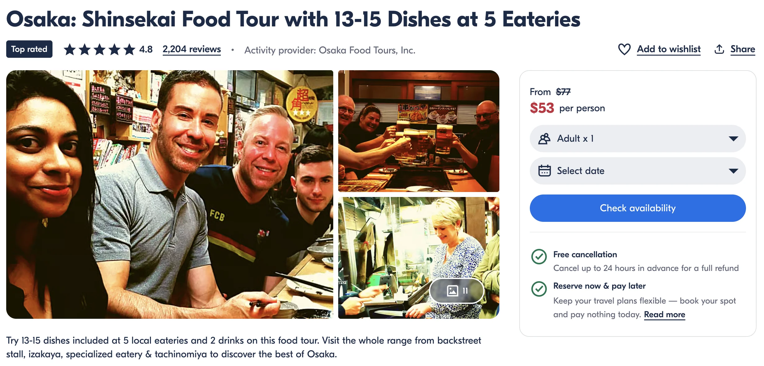 | Hungry Osaka | $61+ | 5.0 (1,700+) | Classic street food + most popular |